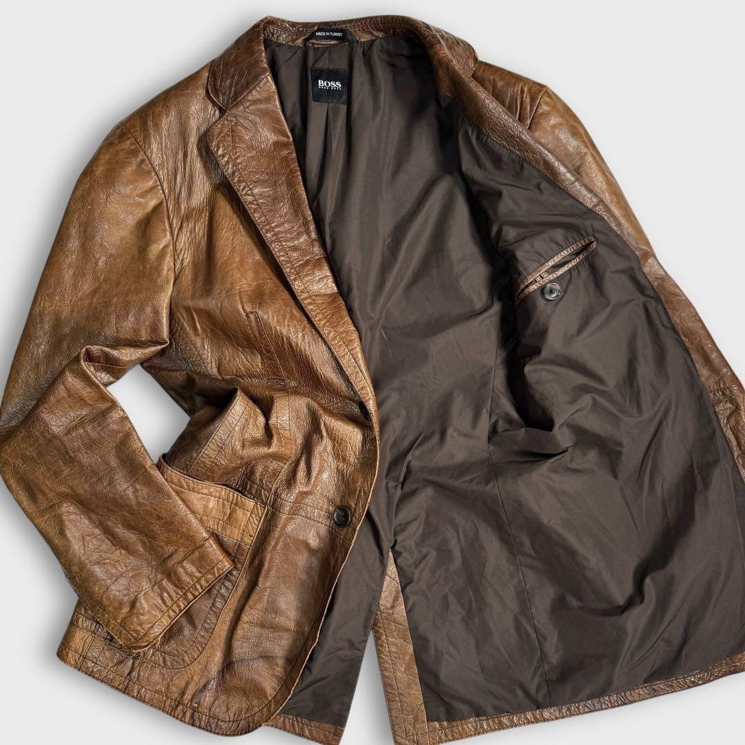 > 希少 Lサイズ ヒューゴボス ラムレザー テーラードジャケット ブラウン メンズ HUGO BOSS レザージャケット ビジネス カジュアル