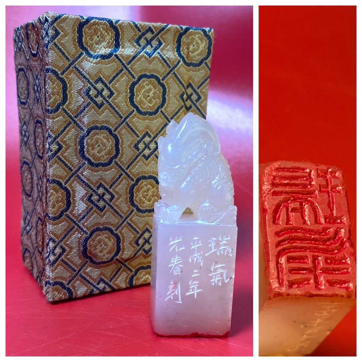 > 瑞氣 光春作 平成二年 共箱 寿山石 青田石 巴林石 彫刻 書道具 印鑑 古印材 印章 書道用品 2.1x 1.2x H5.8cm 印材(13525)