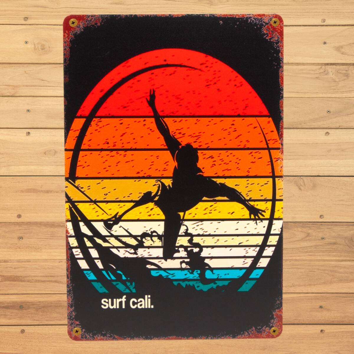 - Surf Cali. 波に乗るサーファーのシルエットのブリキ看板 新品