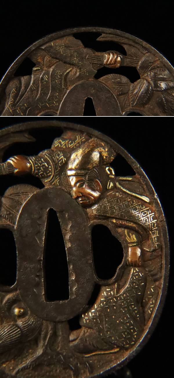 > 【ASAHI】時代 無銘:藻柄子入道宗典製 鉄地 色絵金象嵌 武士にフクロウ図 丸形鍔 7.5cm コレクター放出品 鍔 刀装具 7[79140wi]