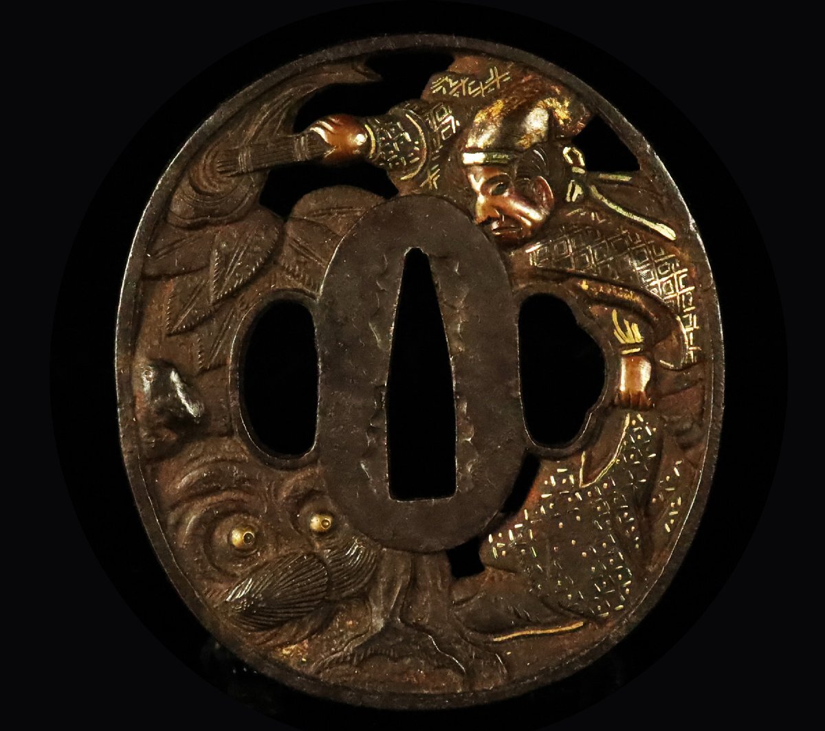 - 【ASAHI】時代 無銘:藻柄子入道宗典製 鉄地 色絵金象嵌 武士にフクロウ図 丸形鍔 7.5cm コレクター放出品 鍔 刀装具 7[79140wi]