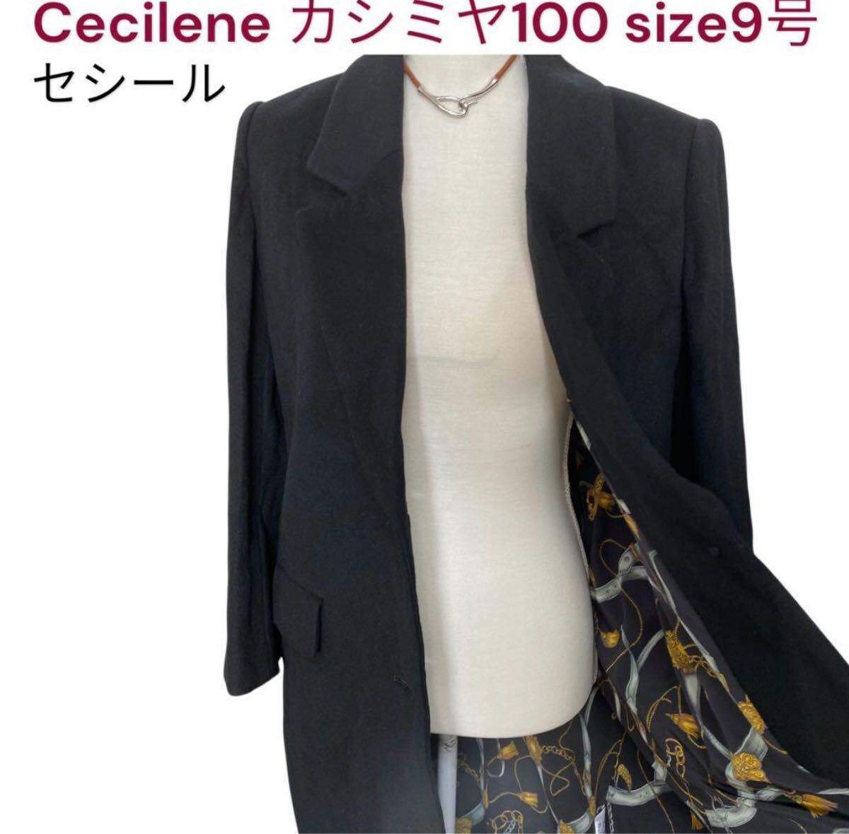 - 美品 セシール セシレーヌ カシミヤ100 裏地総柄 ブラック ロング コート Cecilene 9号、M 黒 ブラック