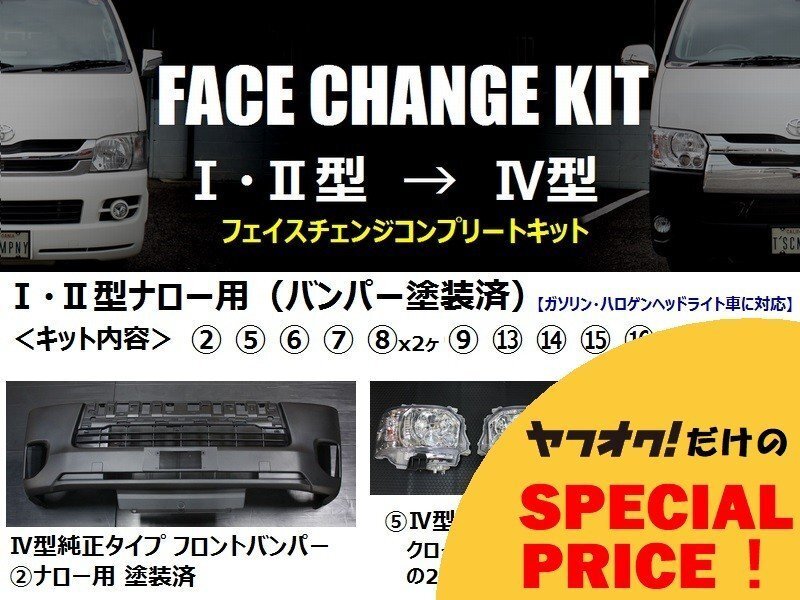 > ▼ 特価 ハイエース 200系 標準ボディ [1型・2型 → 4型] フェイスチェンジキット バンパー塗装済み [S-GL / DX / DX GLパッケージ] HIACE
