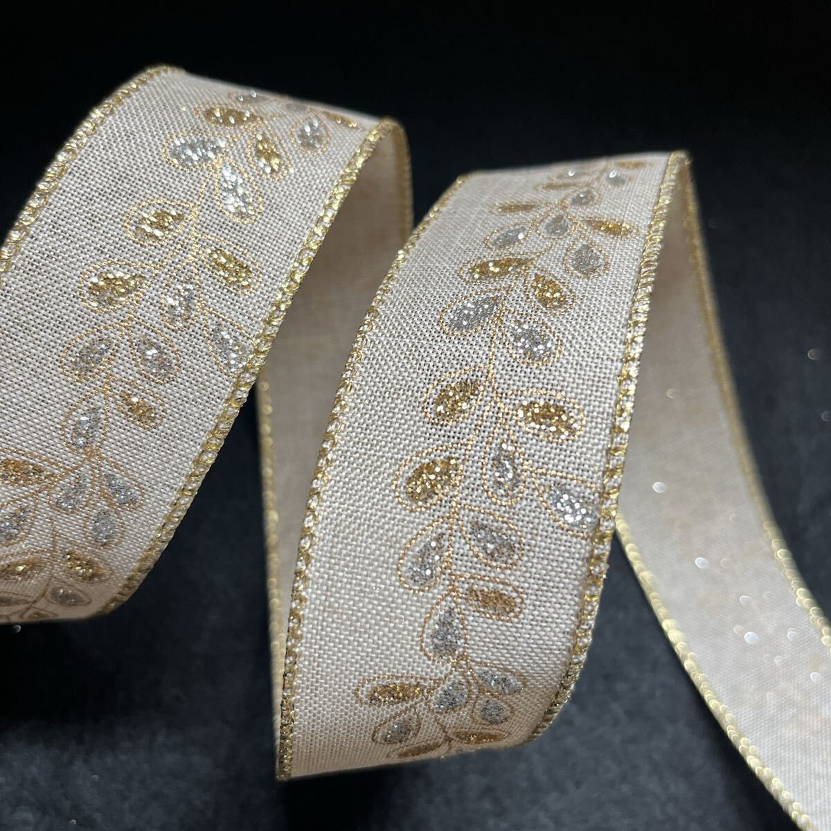 - リボン切り売り 1.5m 約3.8cm幅 麻風 ベージュ リーフ ラメラメ