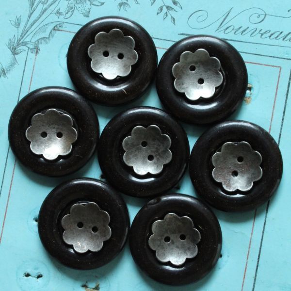 - 即決 ボタン 7個 φ22mm 花 プラスチックxメタル ダークブラウンxシルバー色 フランス輸入