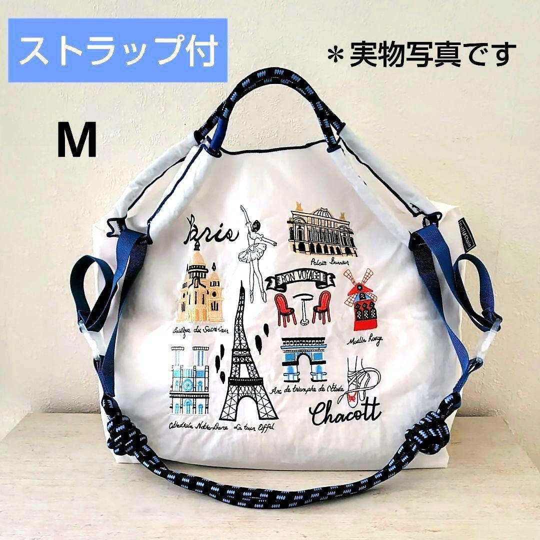 - М チャコット Chacott 刺繍 エコバッグ パリ 白 ホワイト ストラップ付き ショルダー付