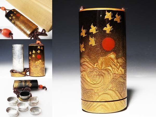 - 【桃】提げ物:蒔絵日の出波千鳥純銀毛彫江戸菊花図鞘印籠