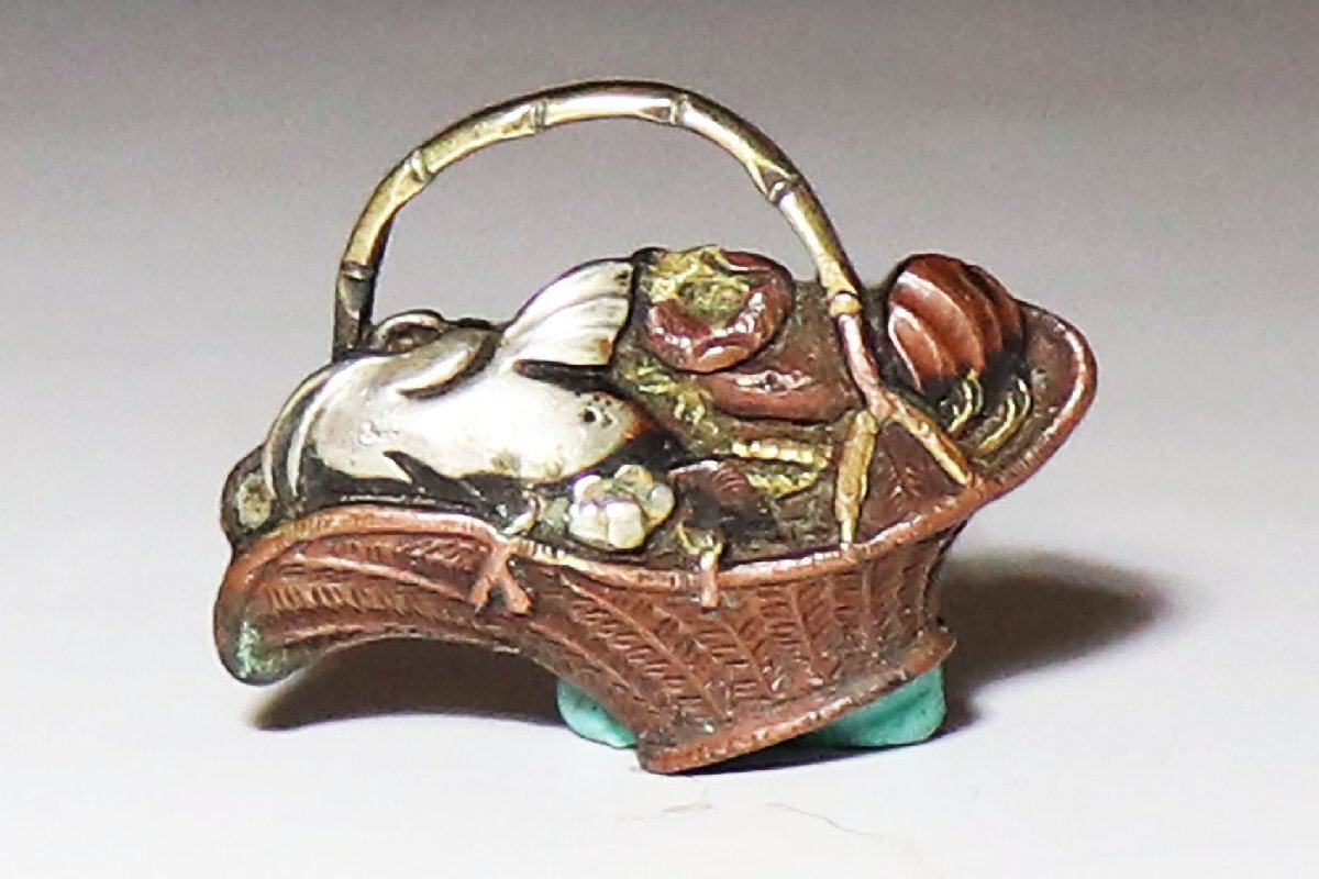 - 【桃】提げ物:金工素銅地銀象嵌盛り籠煙草入れ飾り金具