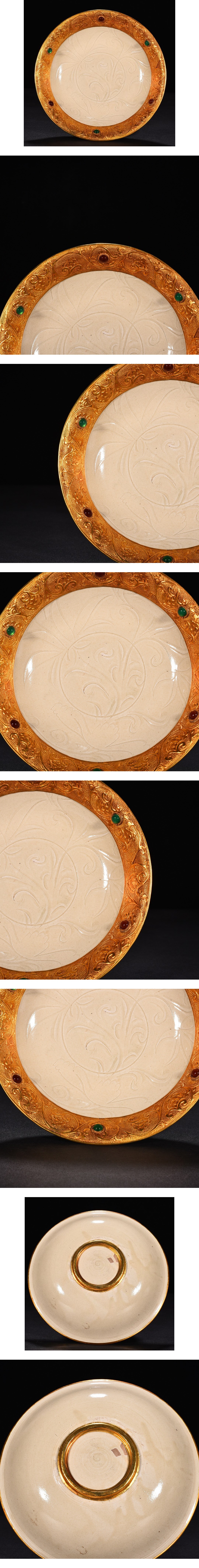 - TA391■宋朝時代 定窯包金 嵌寶石 刻花卉紋盤 時代物 古玩 唐物 古陶磁器■