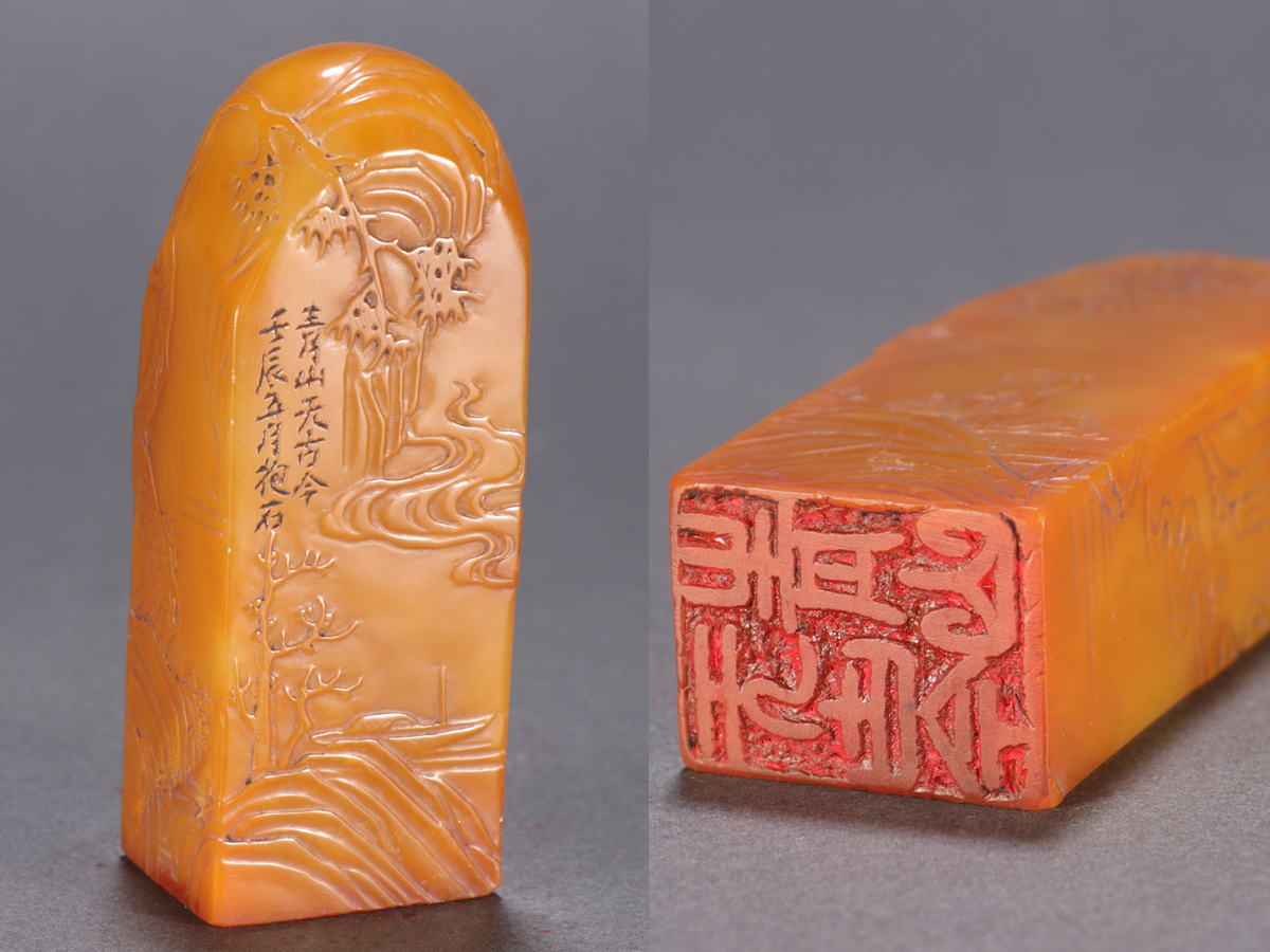 - ▽鴻▽金石篆刻 傅抱石銘 寿山田黄石彫 山水人物紋印章 印鑑 共箱 時代物 中国古美術 骨董品
