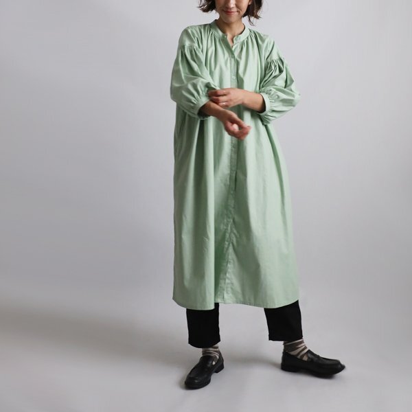 - 日曜日終了 1000円からスタート 上質ギマ擬麻コットン ゆったり 前開き シャツ ワンピース パフ袖 羽織り ミントグリーンU81A