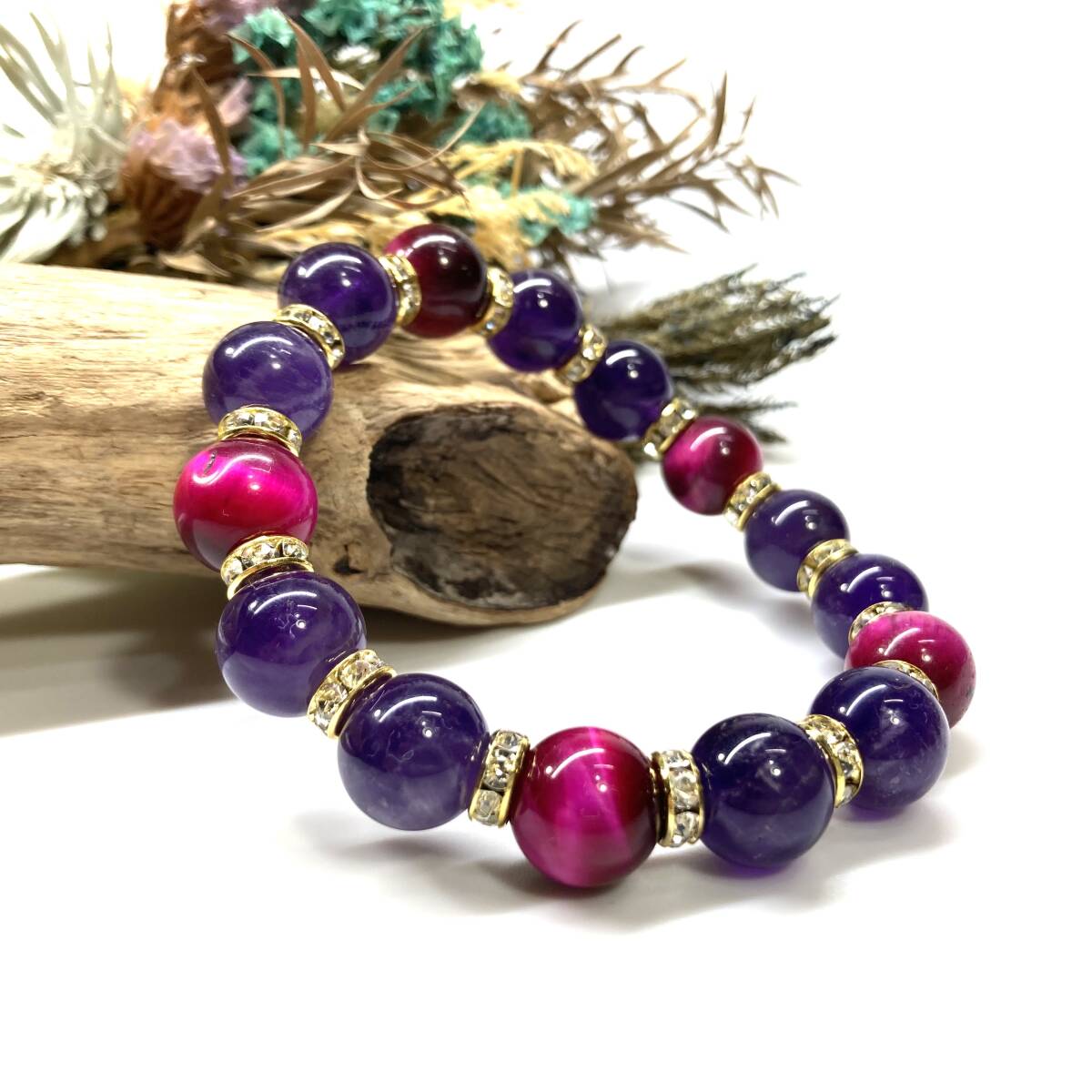 > ピンクタイガーアイ&アメジスト パワーストーン ブレスレット 天然石ブレス (ゴールド) 12mm 金運 仕事運 メンズ・レディース 男性 女性