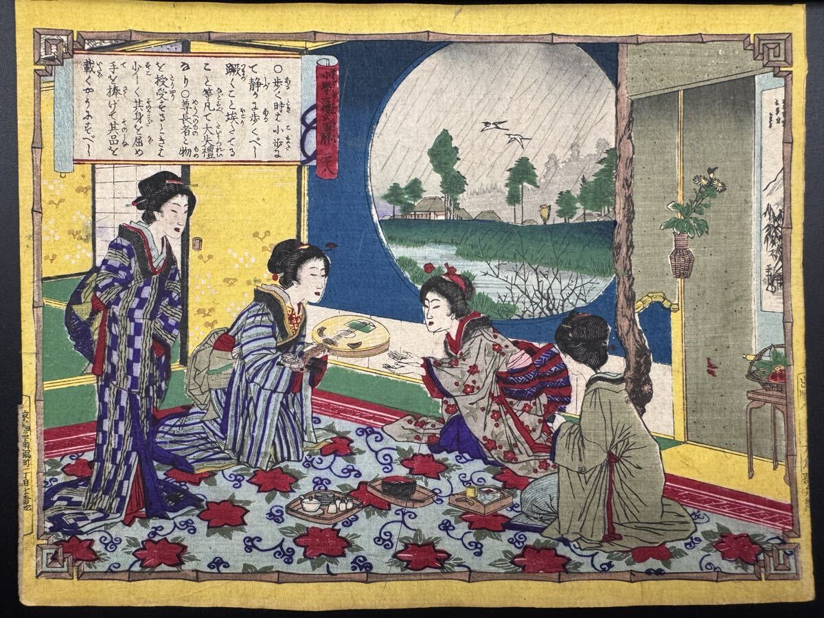 - 【真作】5 本物浮世絵木版画 安達吟光「小学女禮式図解」明治期 美人画 教育画 錦絵 中判 保存良い