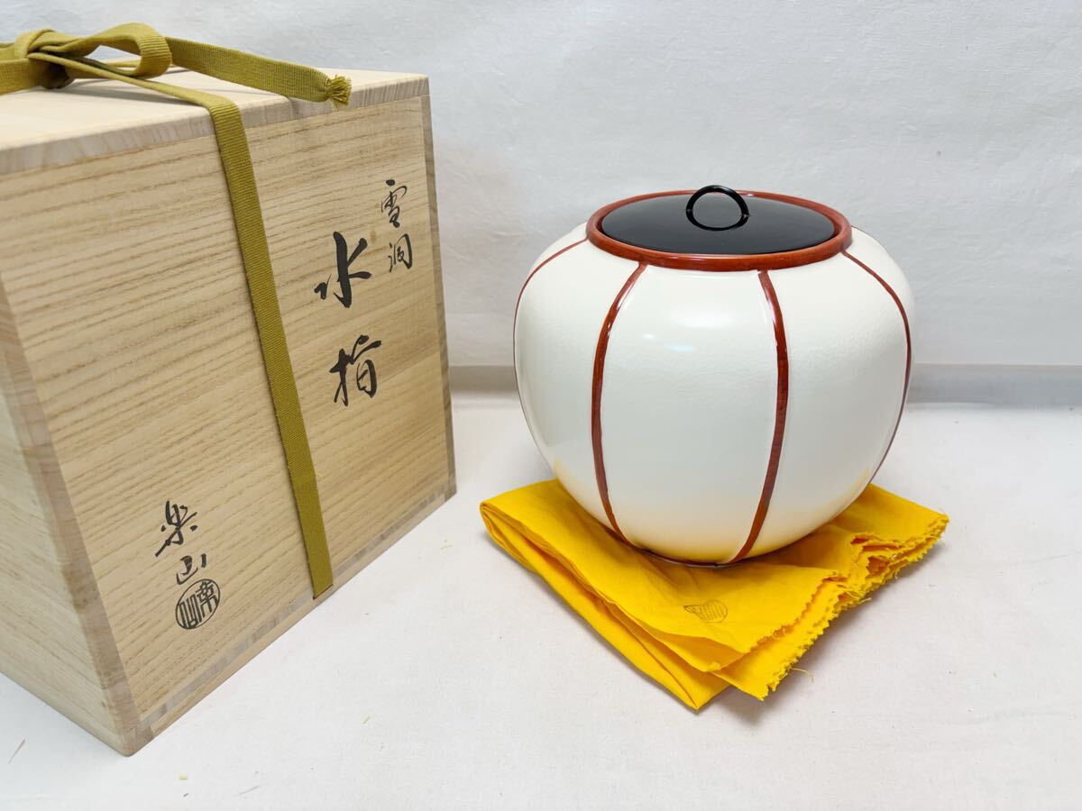 - M704387 未使用 茶道具 楽山作 雪洞水指 塗り蓋 作家物 煎茶道具 茶懐石 水屋道具 水差 茶器 茶具 茶事 茶会 茶道 共箱 外段ボール箱入