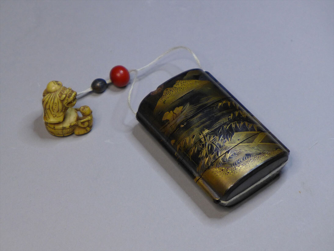 江戸時代 時代提げ物 漆塗山水水辺舟図印籠 検/根付瑪瑙蒔絵漆芸