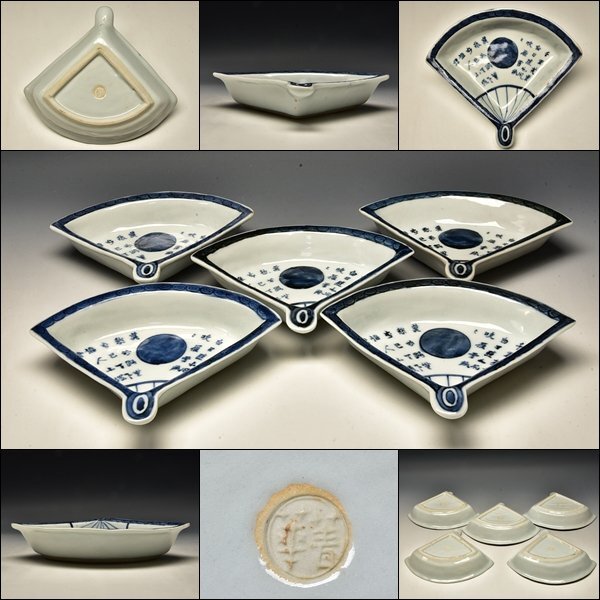 - SP6329 須田菁華 青華 染付 扇形 向付 皿 五客 会席 懐石 須田青華