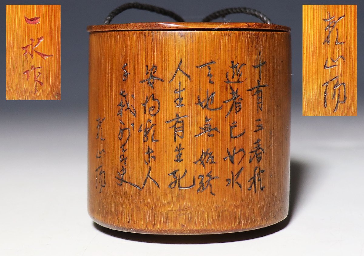 - 【桃】提げ物:竹彫詩文図トンコツ煙草入れ 一水作