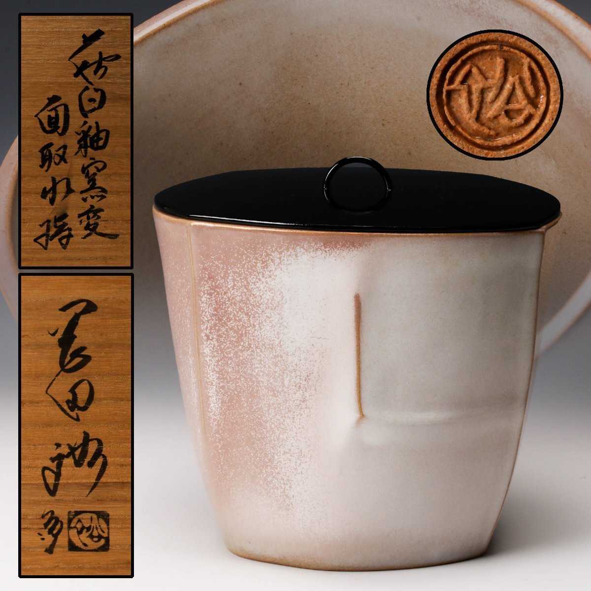> 【佳香】岡田裕 萩白釉窯変面取水指 共箱 共布 栞 塗蓋 茶道具 本物保証