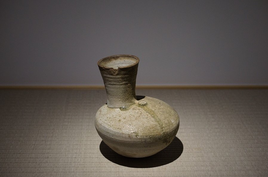 須恵器の平瓶です。渋みのある、かすれたような自然釉がかかっており、侘びた花の映りがすばらしいものです。わずかに口のカケがあるくらいで、その他良好、水も入ります。