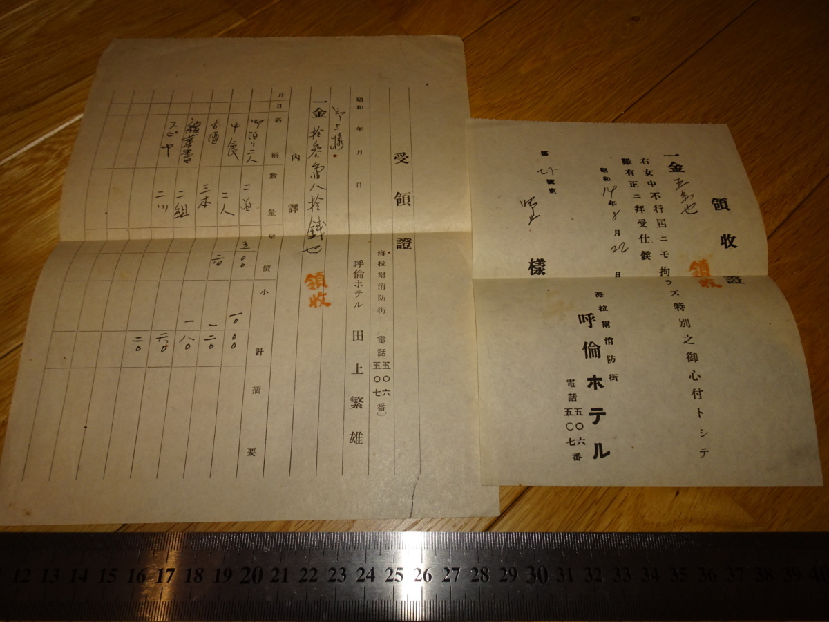 - Rarebookkyoto 2F-A896 領収書シリーズ ホテル 呼倫 羽守コレクション 1939年頃 名人 名作 名品