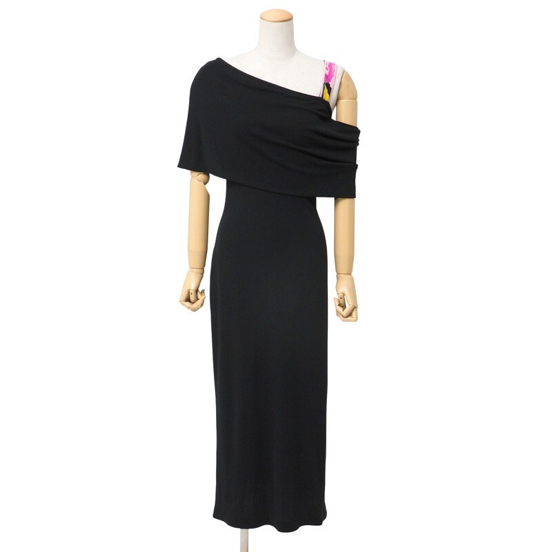 - TJ5019★LEONARD レオナール ジャージー生地 ストレッチ アシンメトリー 部分:花柄 ロングワンピース イブニングドレス ブラック サイズ38
