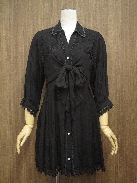 > 美品 アクシーズファム axes femme ひざ丈 ラグランスリーブ 九分袖 シャツワンピース M ブラック 花柄
