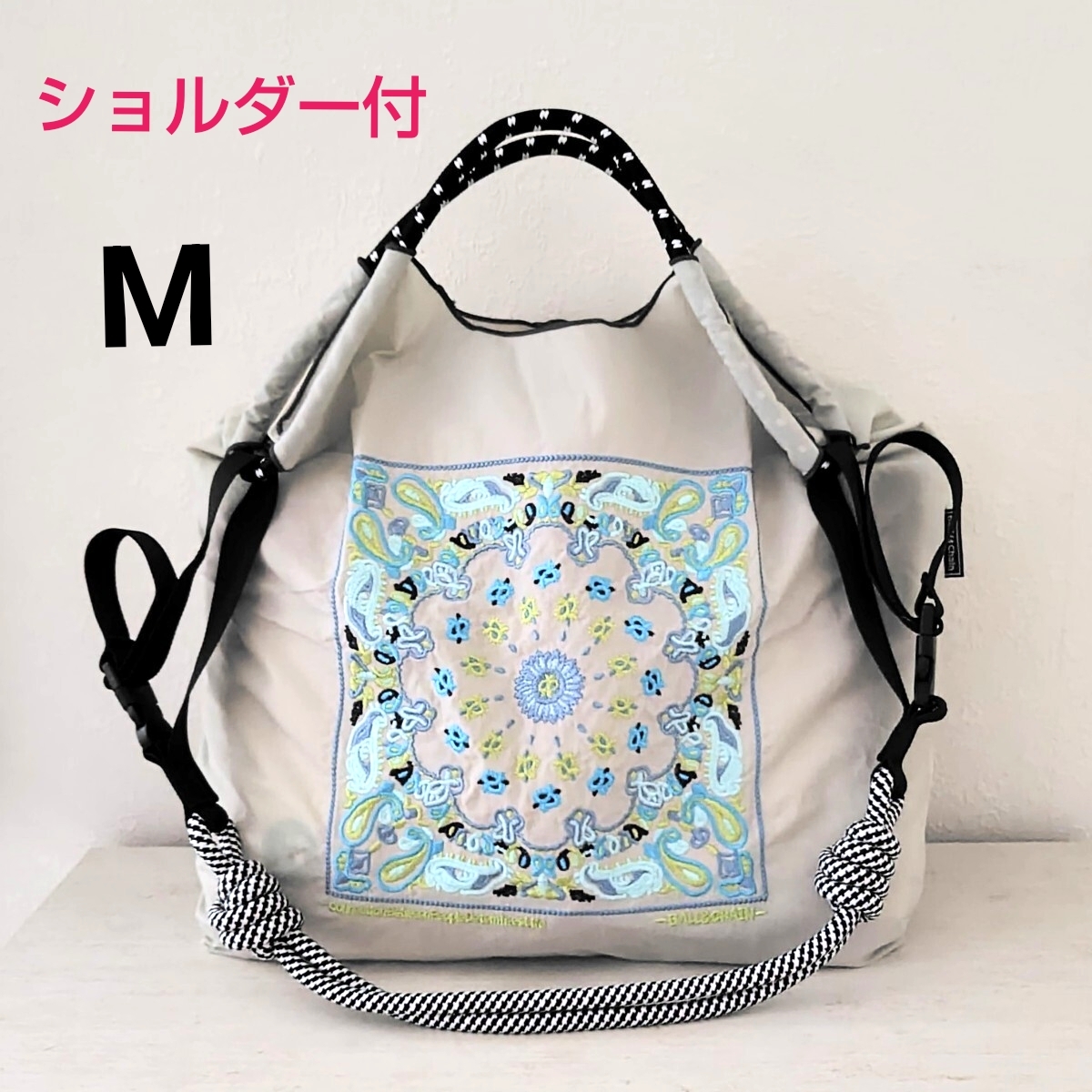- М ボールアンドチェーン ペイズリー バンダナ グレー 刺繍 エコバッグ ストラップ付き ショルダー