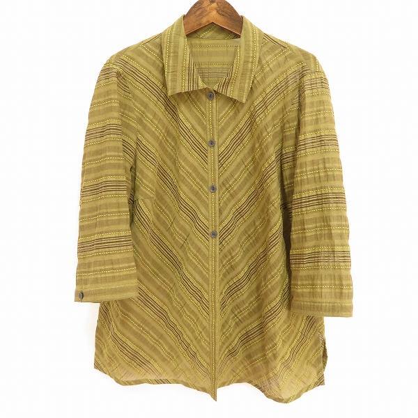 > #anc レリアン Leilian 七分袖 シャツ ブラウス 13+ 大きいサイズ カーキ系 ボーダー レディース [912222] k01