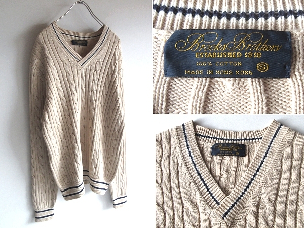 - 希少 90sビンテージ Brooks Brothers ブルックスブラザーズ Vネック コットン ケーブルニット チルデンニット S ベージュ USA企画 VINTAGE