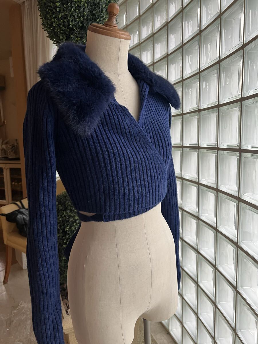 > ザラZARA★紺 ネイビー ショート丈 カシュクール ニット トップス エコファー襟 Sサイズ USED♪c