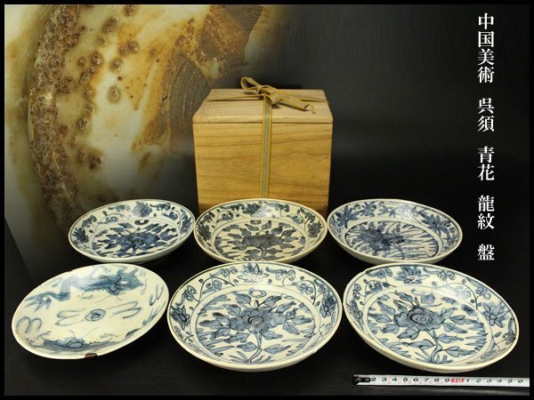 - 【銀閣】中国美術 呉須 青花 龍紋 盤 六件 φ18.5cm 旧家蔵品 送料無料(YB640)