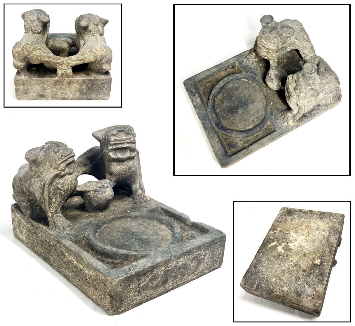 - 年代物 双獅青石古硯 手彫り 置物 約3kg 中国古美術 稀少 天然石 自然石 天然硯 文房四宝 書道用品 (旧家蔵出し) WWFT044