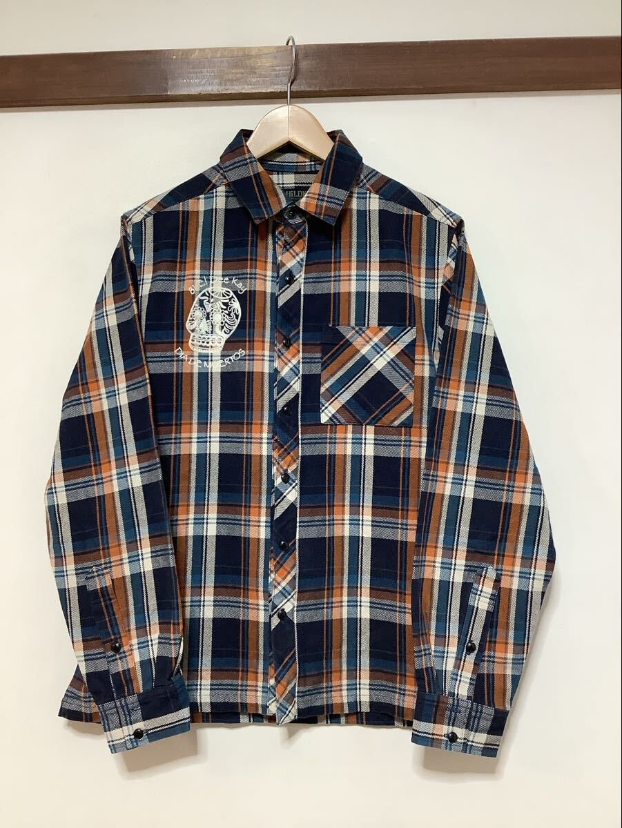 - し1756 HiLDK チェックネルシャツ 長袖シャツ L アメカジ ストリート ネイビー/オレンジ/ブルー/ホワイト メキシカンスカル 日本製