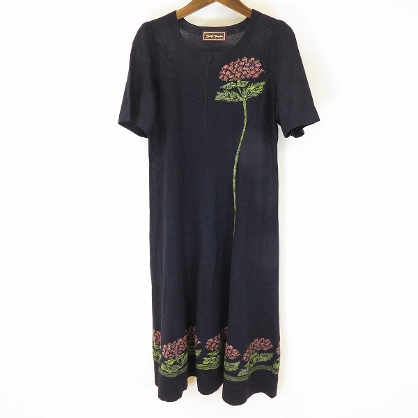 > #s サイトウトヨコ 斉藤都世子 ニット ワンピース 紺 ネイビー 半袖 ロング ラメ 花柄 前ジップ ハーフジップ 917775 k01