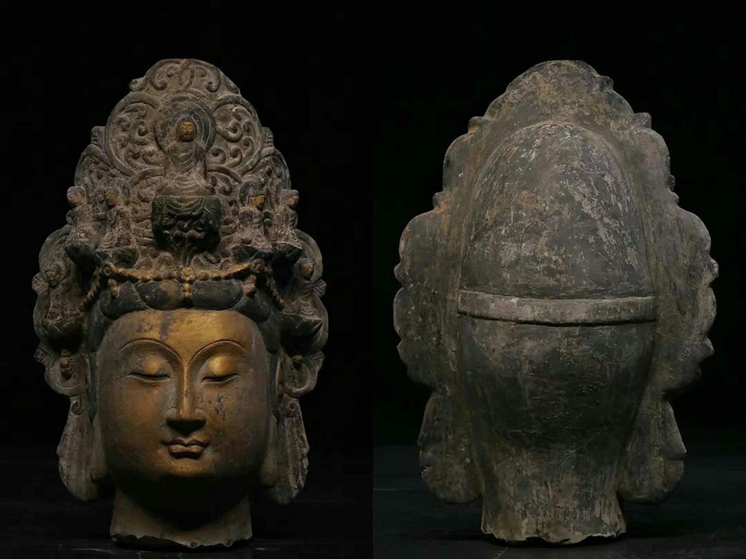 - ▼渡鶴羽▼R5993北魏時代 青石仏首 菩薩像 青石細工彫刻★仏教古美術★仏像★細密細工★廃寺旧蔵★廃寺買出品