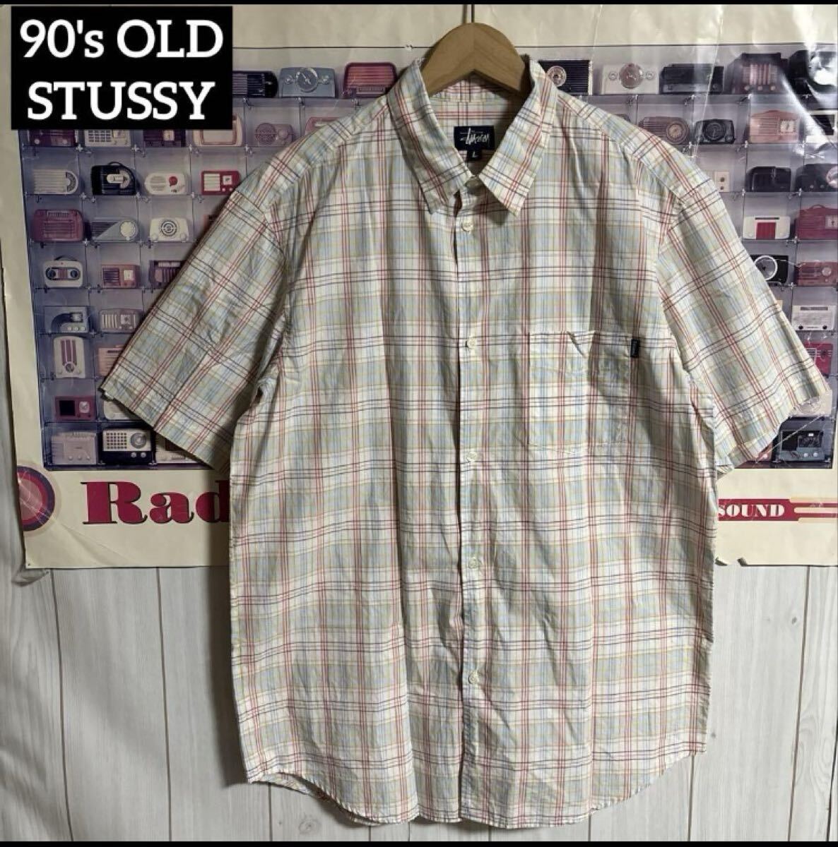 - 90s紺タグUSA製OLD STUSSYマルチチェック柄半袖シャツLオールドヴィンテージ