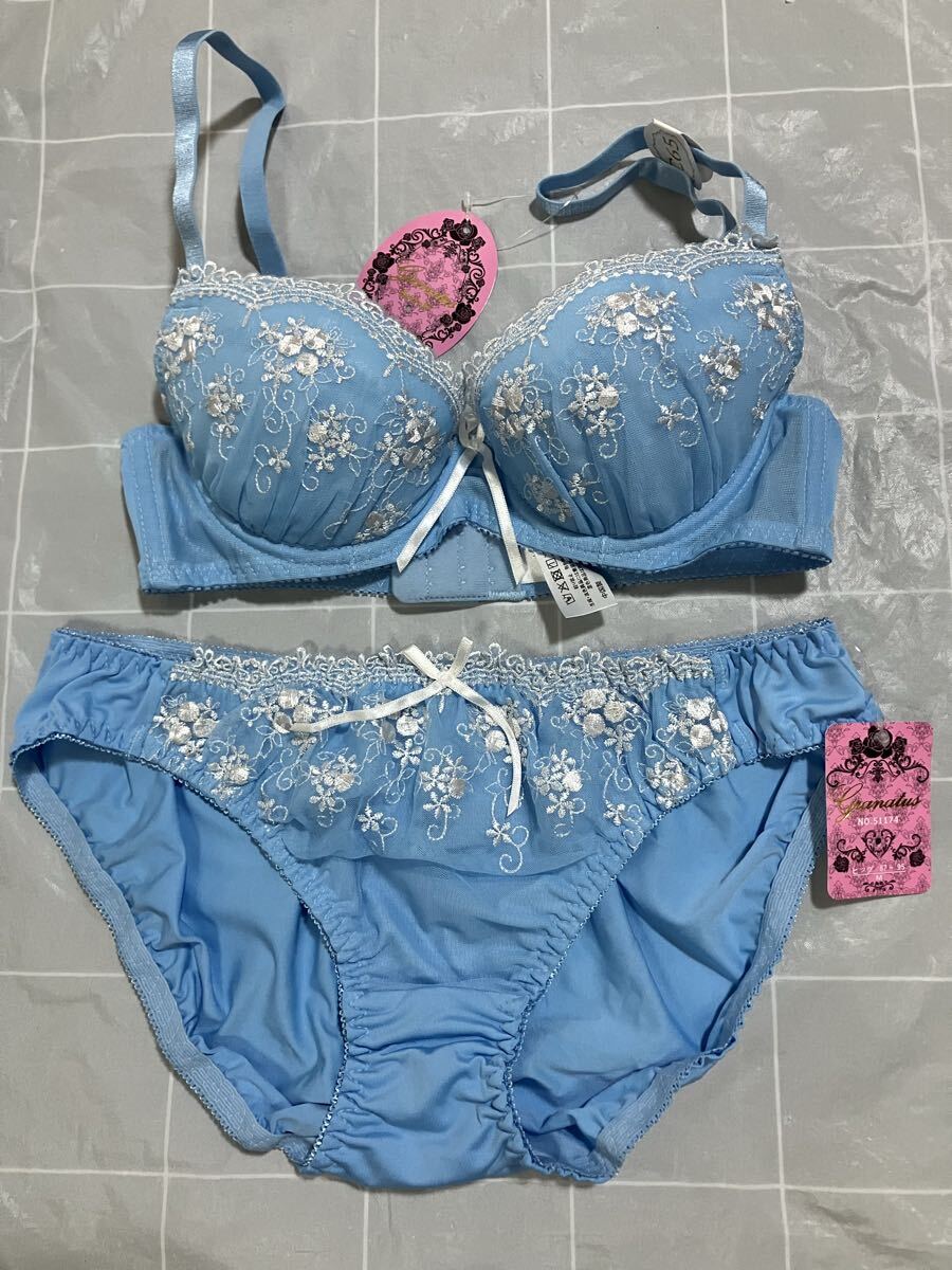 - C65M グラナティス 花柄刺繍のブラ&ショーツセット ブルー