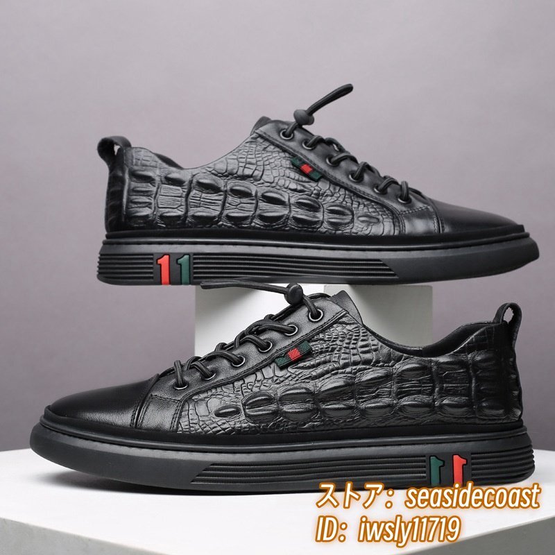 - 最高級 メンズ スニーカー 鰐柄 本革 レザーシューズ 牛革 柔らか メンズシューズ 運動靴 紳士靴 上質 カッコイイ 男女兼用 新品 黒 25.0cm