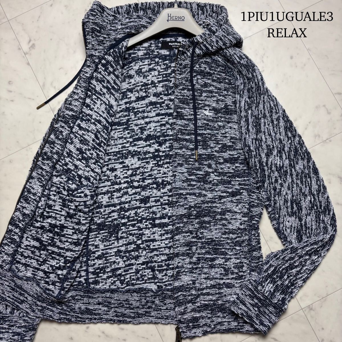 > 美品★ 1PIU1UGUALE3 RELAX ストレッチ メランジ ニット ジップ パーカー ジャケット フーディー ブルゾン M ロゴ刺繍 ネイビー ウノピゥウ