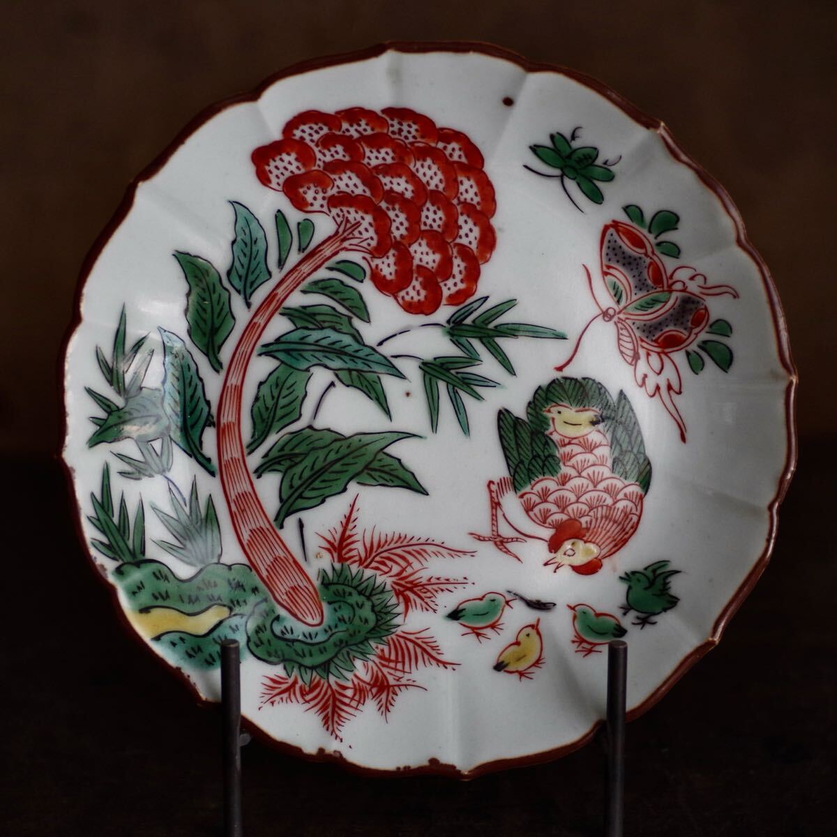 > 【無傷】鶏花鳥文南京赤絵五寸皿 清朝 中国古玩 茶道具 向付 古九谷 小皿 取皿 菓子皿 古民藝 骨董 古陶 中国美術 南京焼 明末清初 古染付