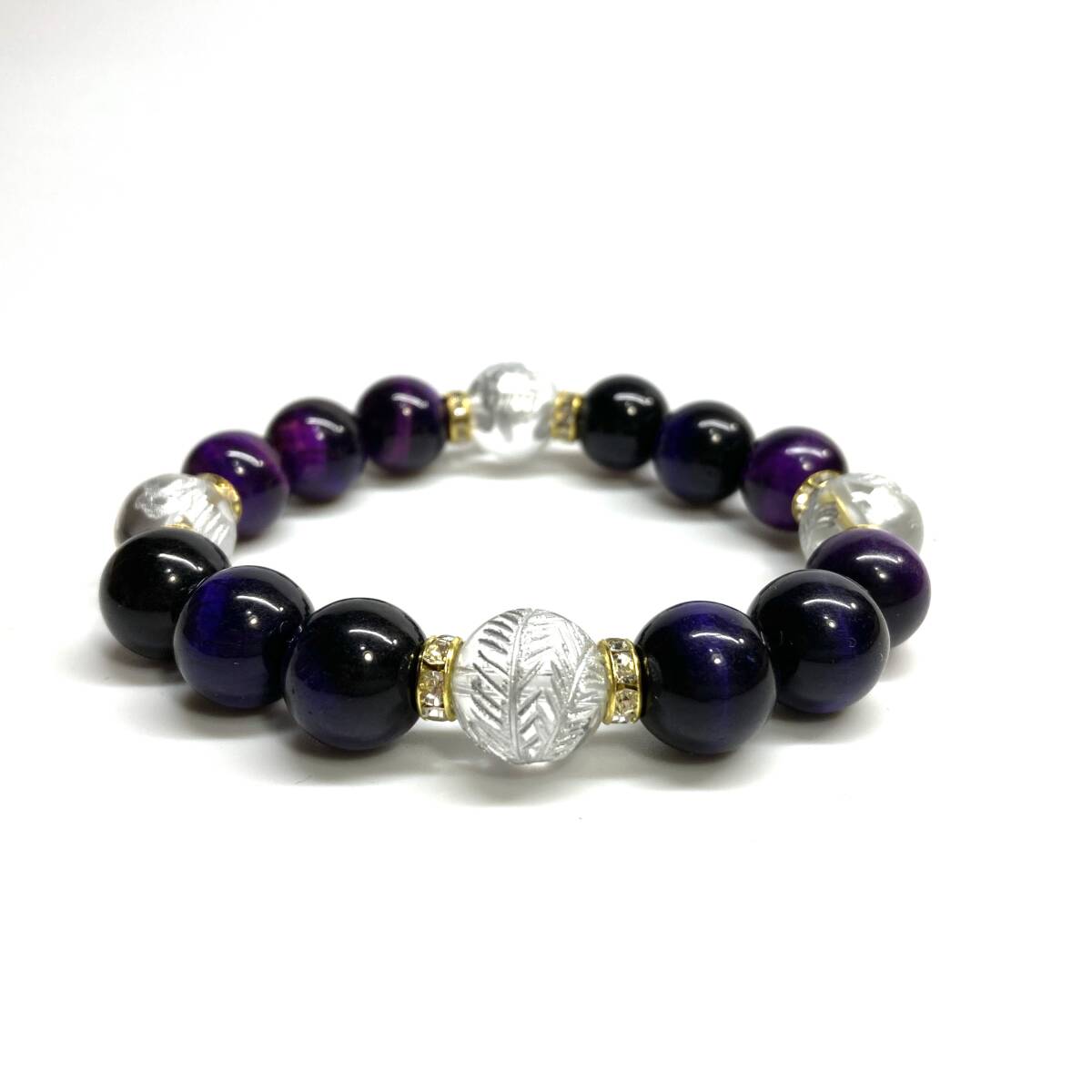 - 四神獣銀彫水晶×パープルタイガーアイ 12mm パワーストーン ブレスレット天然石 青龍 白虎 玄武 朱雀 運気上昇 お守り 四神獸 四神相応 G
