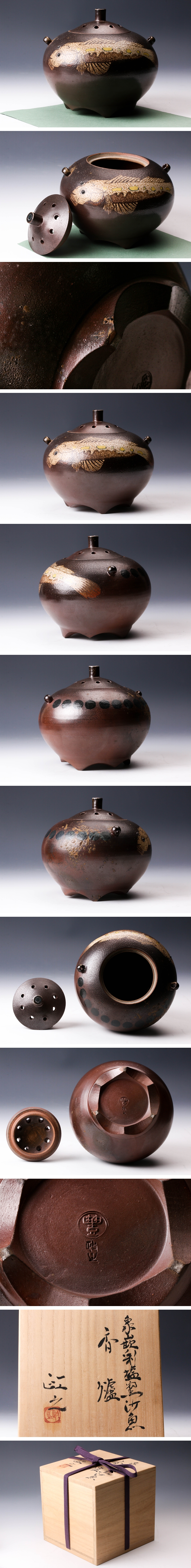【佳香】今井政之 象嵌彩塩窯沙魚(はぜ)香炉 共箱 茶道具 本物保証