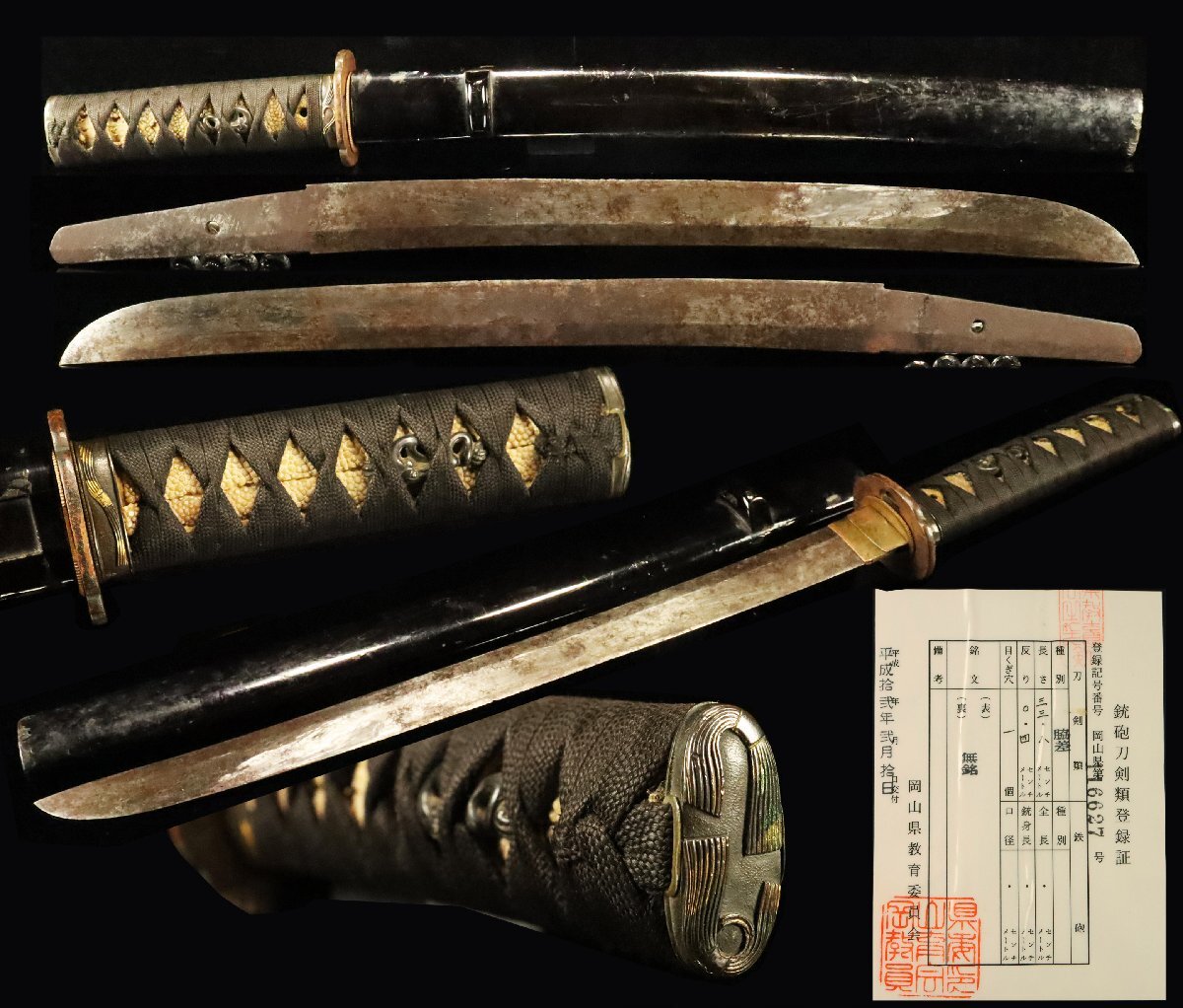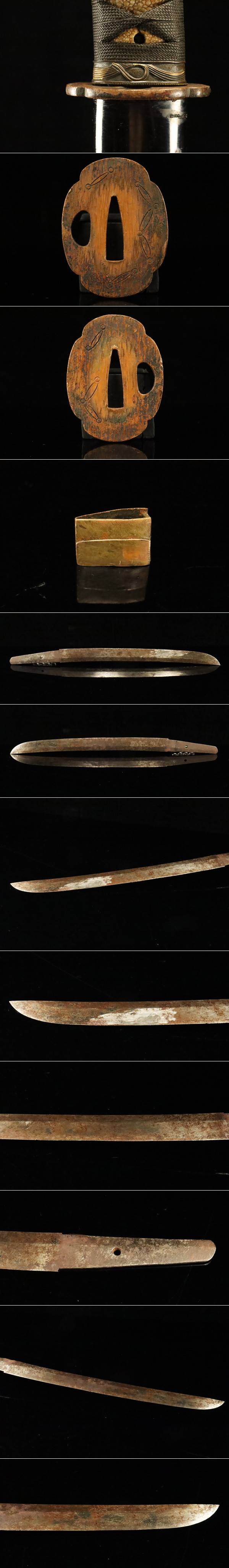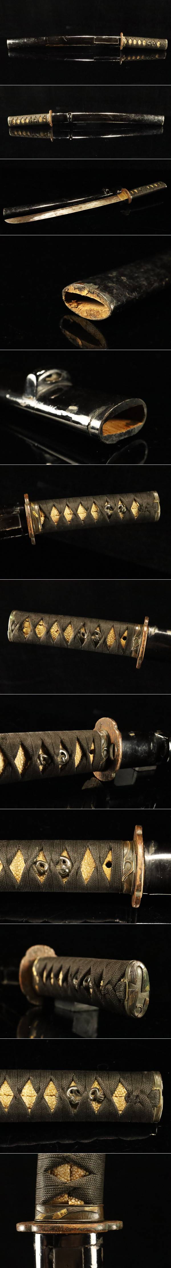 > 【ASAHI】時代武具 旧家蔵出品のうぶ出し 無銘 脇差 33.8cm 鮫皮巻柄金象嵌縁頭 銅地鍔 黒塗鞘[710115qe]