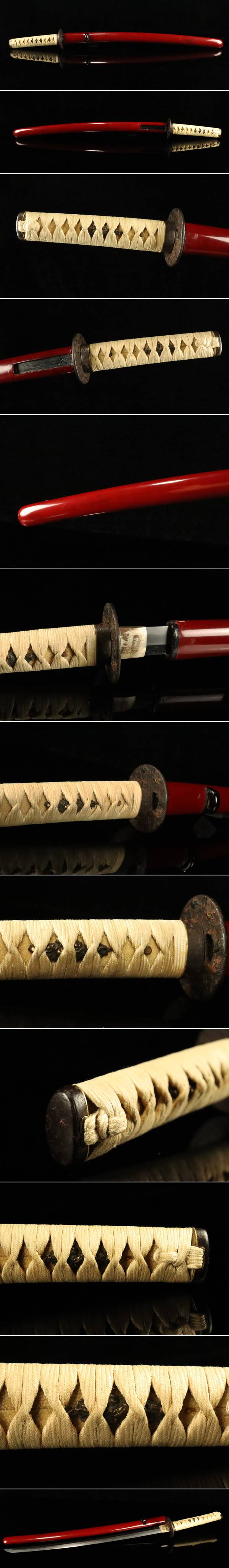 - 【ASAHI】無銘 脇差 48.3㎝ 乱刃 働き豊富の乱れ刃 朱塗鞘拵え鮫皮巻柄 鉄地一作縁頭鍔 時代刀剣[7103yp]