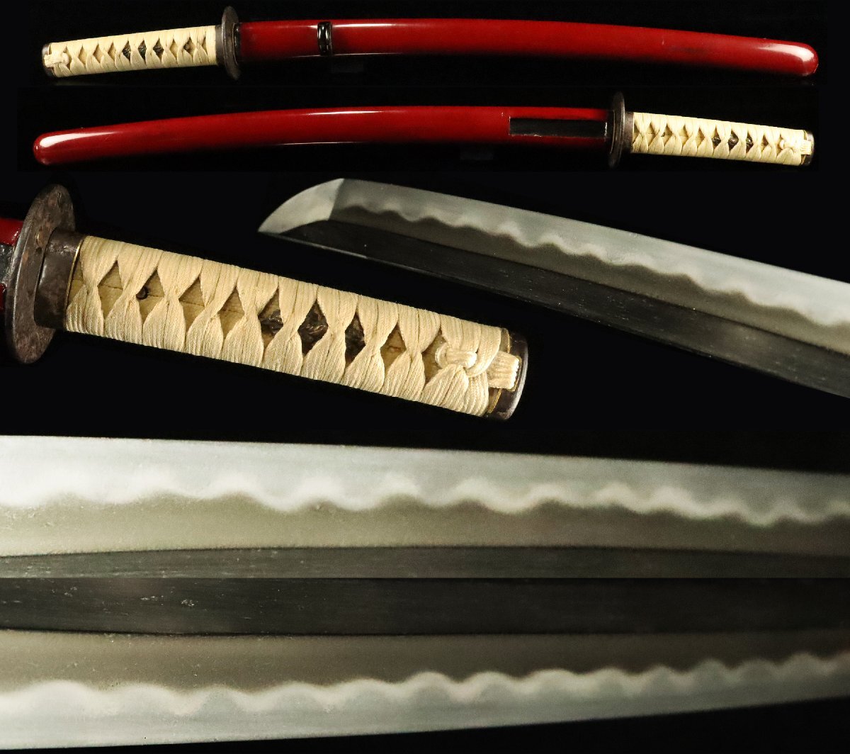 > 【ASAHI】無銘 脇差 48.3㎝ 乱刃 働き豊富の乱れ刃 朱塗鞘拵え鮫皮巻柄 鉄地一作縁頭鍔 時代刀剣[7103yp]