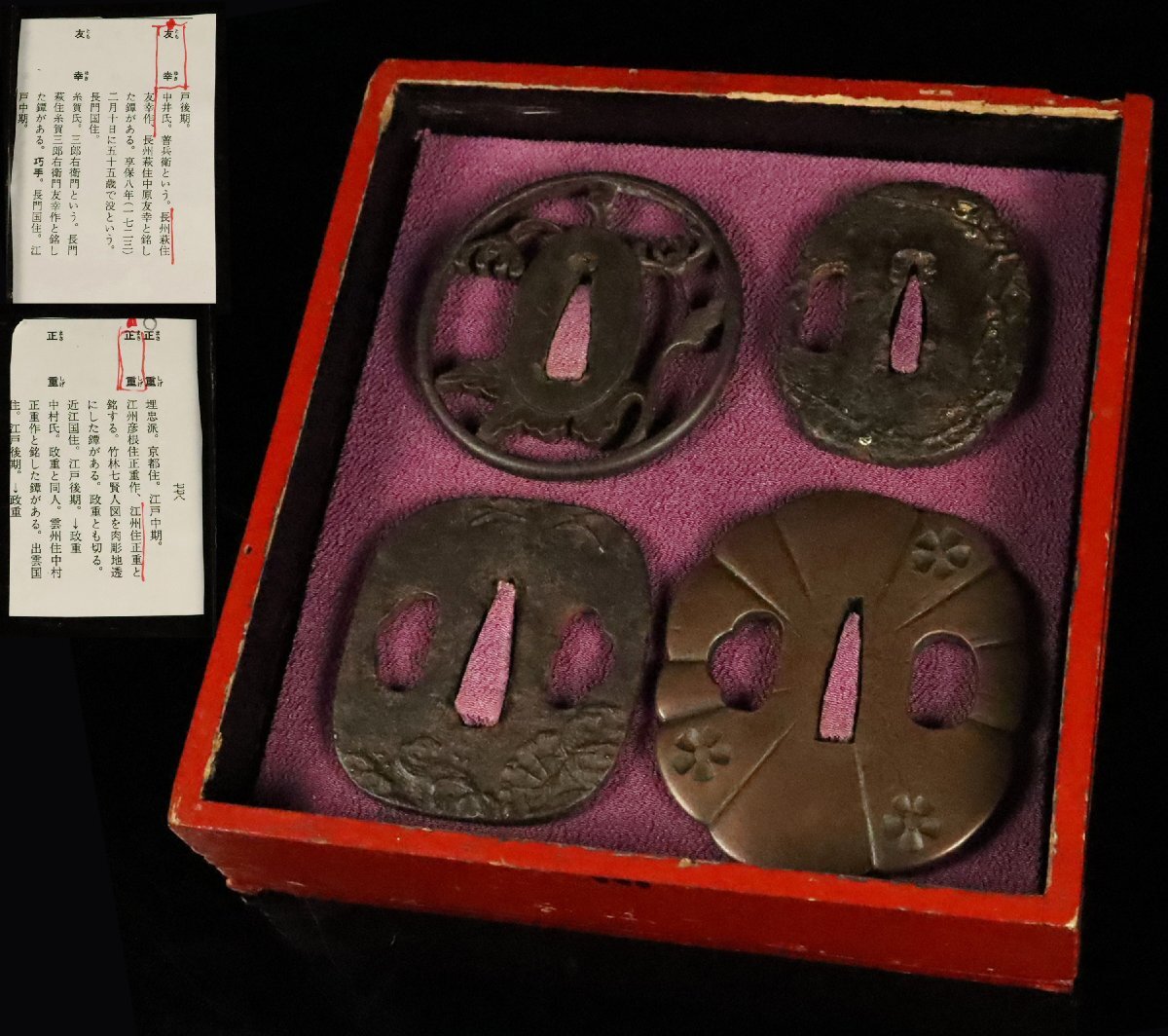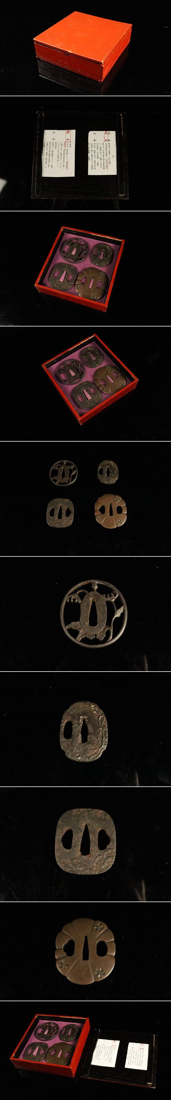 - 【ASAHI】時代武具 鍔 四点まとめて 友幸 正重 透かし 鉄地 銅地 象嵌 箱付き 旧家蔵出品[79262qq]