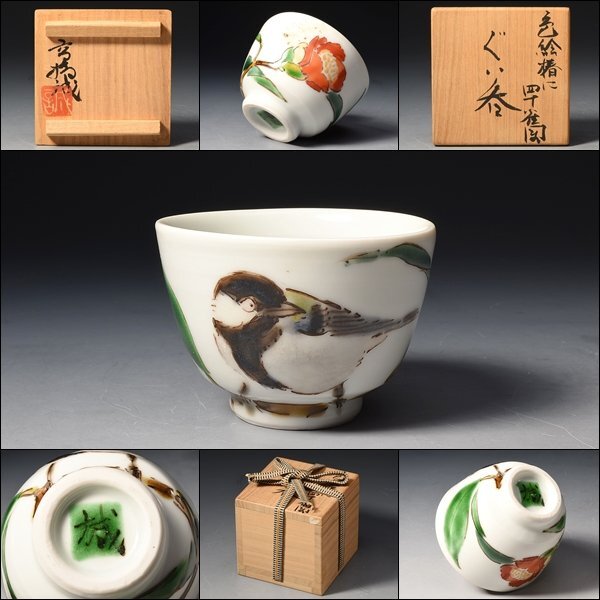 - U08141 東京芸大 高橋誠 色絵 椿に四十雀図 ぐい呑 盃 杯 酒盃 酒杯 酒器 煎茶 茶器 茶杯 共箱
