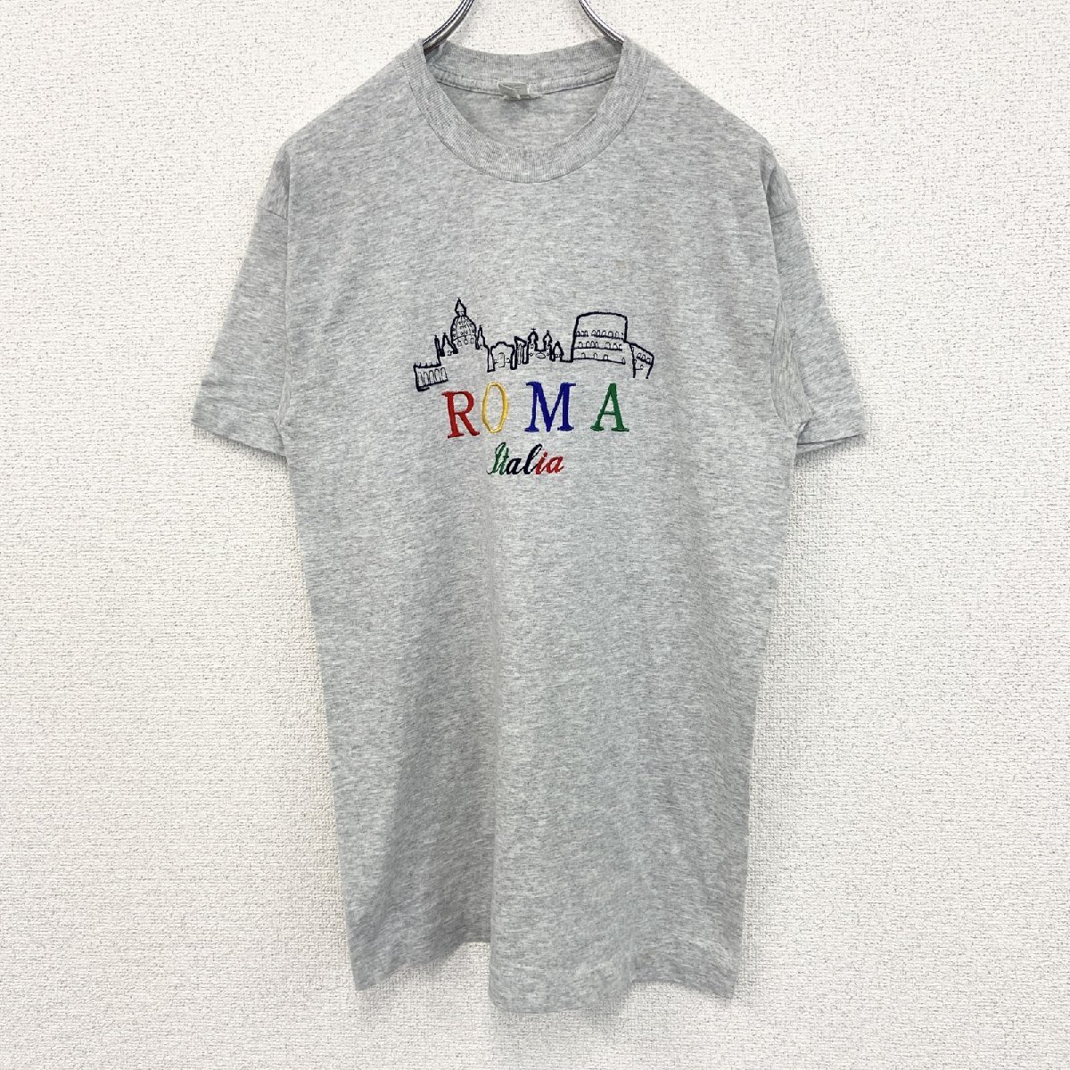 - 古着 used 半袖刺デザインTシャツ ROMA 90s グレー シングルステッチ カジュアル レトロ クルーネック Mサイズ