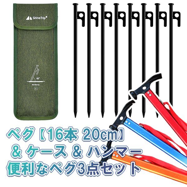 > ペグケース付き ペグ[20cm 16本] ペグハンマー ペグ袋 3点セット 選べるハンマーカラー ペグ入れキャンプソロキャンアウトドアスチールペグ
