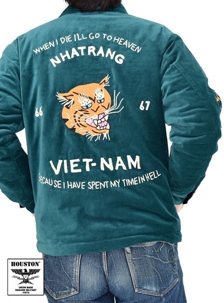> コットン別珍×ナイロン リバーシブルベトジャン◆HOUSTON グリーン XXLサイズ 51515 ヒューストン 刺繍 ベロア 虎 タイガー 和柄